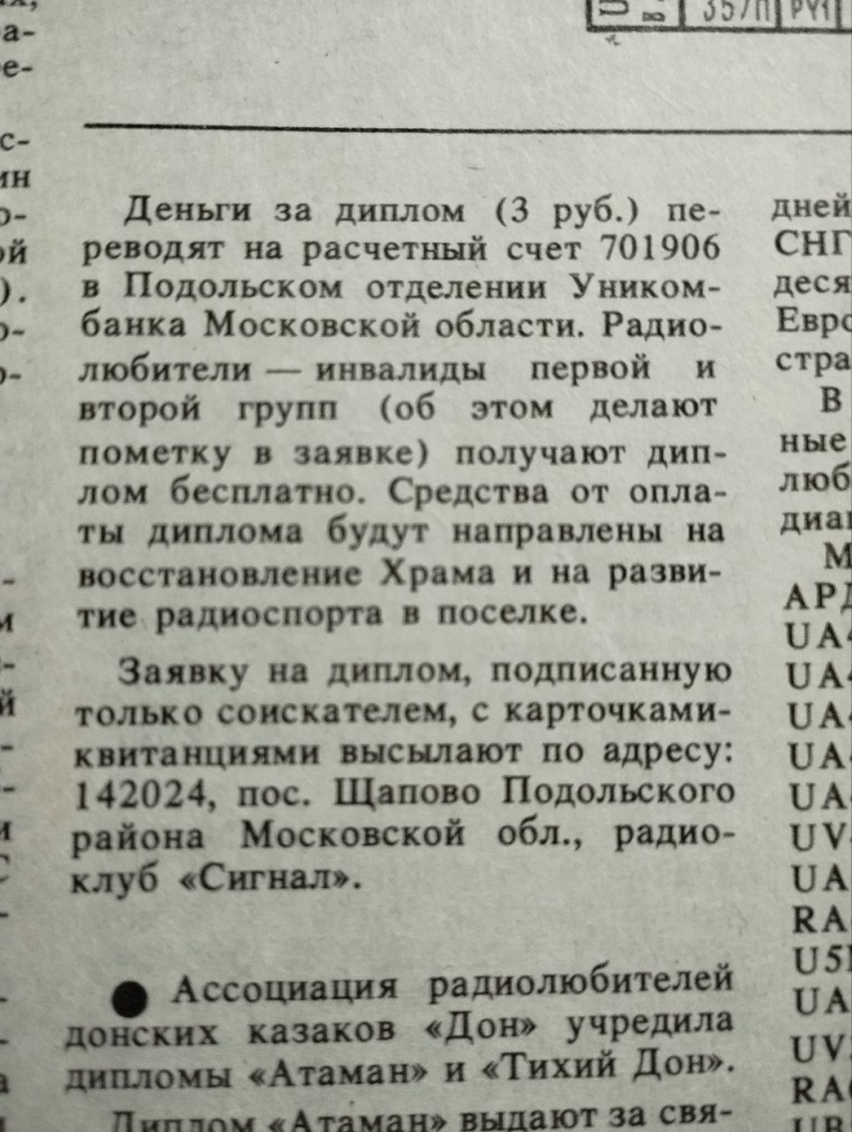 в журнале Радио за апрель 1992 года обнаружил сведения о дипломе, учрежденном радио клубом и приходским храмом.