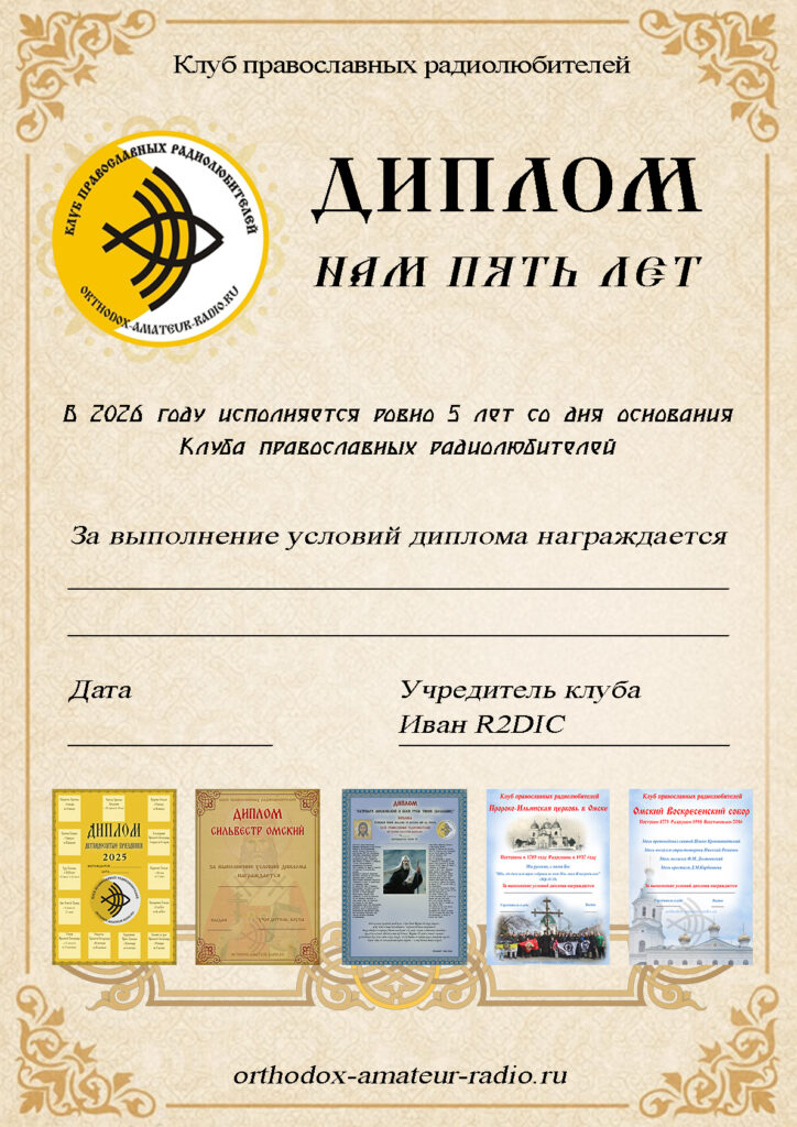 Для получения диплома необходимо провести не менее 5 QSO/SWL с членами клуба. Список на сайте OAR — https://orthodox-amateur-radio.ru/